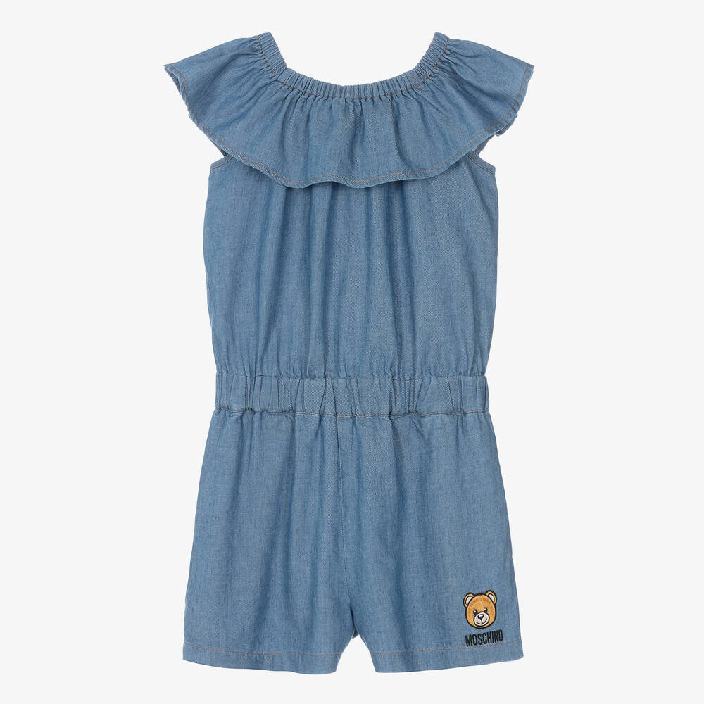 A casual yet stylish piece, this blue chambray playsuit for teen girls is by luxury brand Moschino Kid-Teen. For a signature look, it has an appliqué Moschino Teddy Bear logo patch near the hem with embroidered detailing below. A pretty ruffle adorns the stretchable neckline, and it has an elasticated waist for a cinched shape and comfortable wear. Soft and lightweight, this playsuit has useful pockets hidden in the side seams.