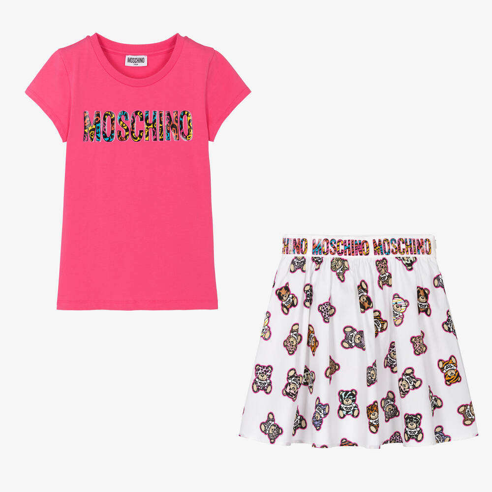 Pink and white skirt set for teen girls by Moschino Kid-Teen, creating an unmistakable designer outfit. Made in soft cotton jersey, the short-sleeved T-shirt has a colourful logo print on the front with a vibrant leopard print effect. Synonymous with the designer's bold aesthetic, the poplin skirt is covered with Moschino Teddy Bear motifs which are outlined in pink. It lightly gathers on the waistband for a fuller shape and fastens neatly on one side with a zip.