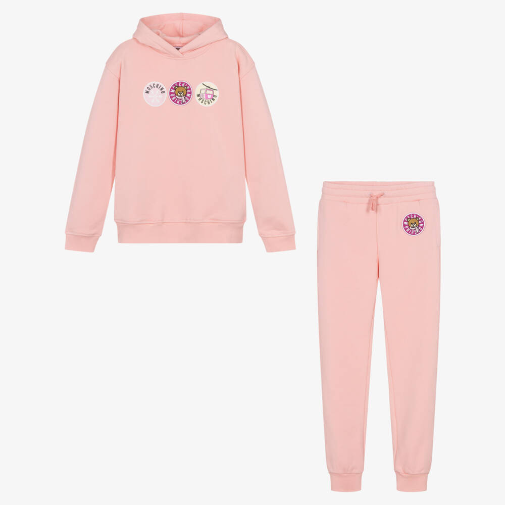 Pale pink cotton tracksuit for teen girls by luxury Italian designer Moschino Kid-Teen, with ski-inspired logo badges printed on the front, including the brand's signature Teddy Bear. Made in comfortable sweatshirt jersey, both pieces have cosy ribbed trims and useful, concealed side pockets. The top has a lined hood, whilst the joggers have an elasticated waistband with a drawstring for a good fit.