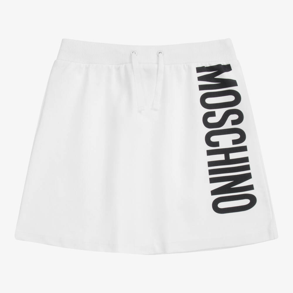 Teen girls white cotton jersey skirt by Moschino Kid-Teen, with a black logo print. Soft and mid-weight, it has a stretchy ribbed waistband with drawstring ties.