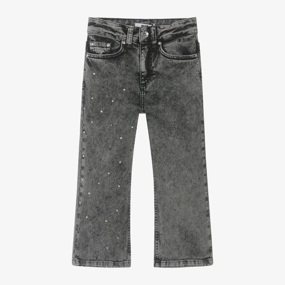 Cool black acid wash jeans for girls by MSGM, with a contemporary straight leg fit and distinctive branded details. Made in cotton denim with a slight stretch for comfort, this five pocket style is patterned with sparkly black and silver diamantés on one side. They are comfortably designed with an adjustable waist and fasten with a zip and button.