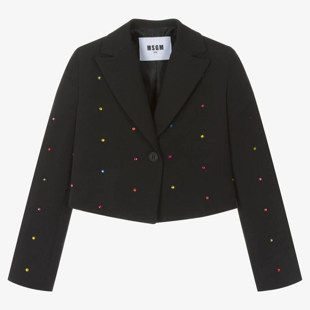 Smart black jacket for girls by Italian brand MSGM, sparkling with colourful diamantés on the front and with a brushed logo badge on the back. Cropped in style with classic lapels and a single logo button fastening on the front, it is lined in lightweight satin for comfort.