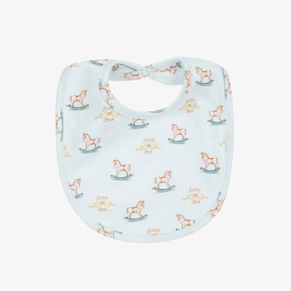 A pale blue bib for baby boys by My Little Pie, made and lined in super soft, organic Supima cotton jersey. Ideal for catching little spills, it is patterned with a charming rocking horse design and the words 'Little One'. It fastens on the back of the neck with a quick and easy popper.