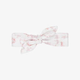 White headband for baby girls by My Little Pie, made in soft organic Supima cotton jersey with a delicate blue floral pattern. It has a large bow on the front and an elasticated back to keep it comfortably in place.