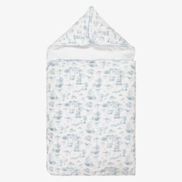 Cosy nest for baby boys and girls by My Little Pie, featuring a charming Toile de Jouy cupid print in soft blue shades. Made in soft organic Supima cotton jersey for a gentle feel against delicate skin, it is lightly padded for warmth and comfort and trimmed with delicate picot embroidery. It fastens easily with poppers along the sides and on the hood, allowing it to be opened and laid flat, providing a comfortable surface for baby to lie on.