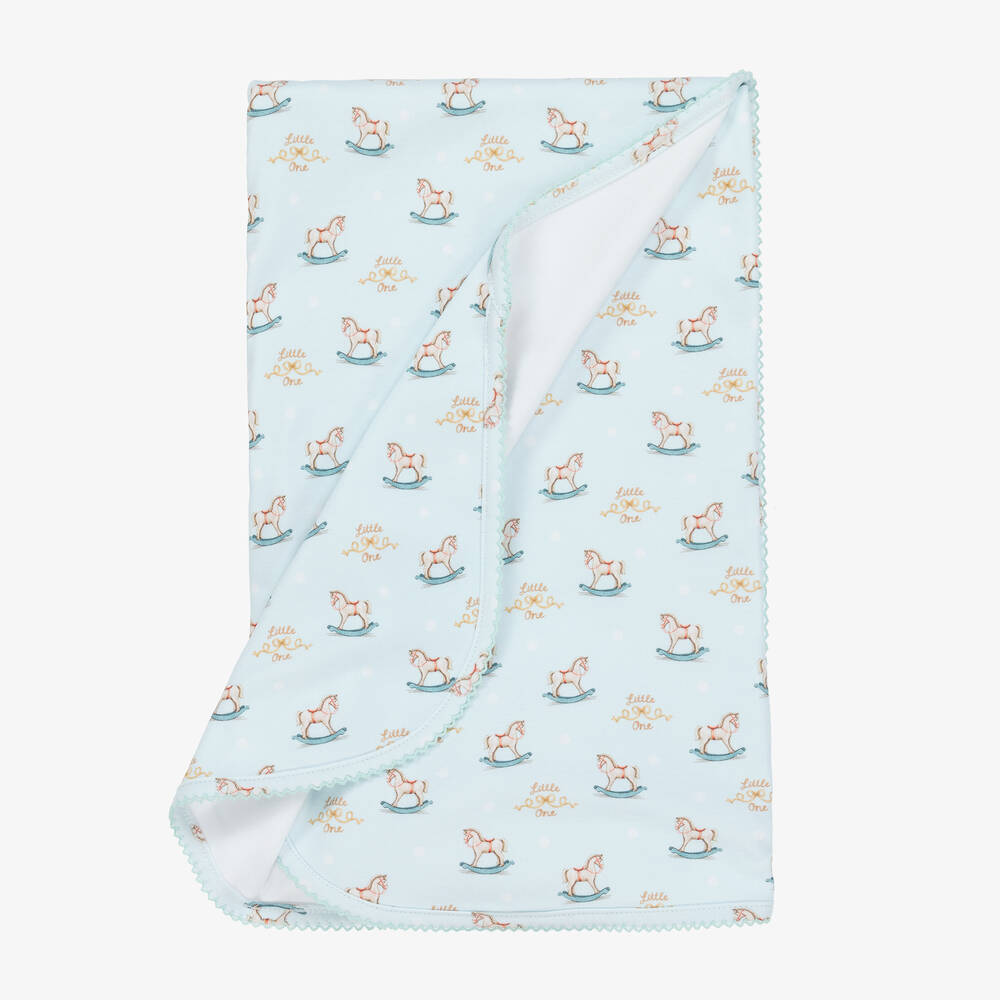 Pale blue blanket for baby boys by My Little Pie, made in a double layer of super soft organic Supima cotton jersey. With an embroidered picot trim, this lovely nursery accessory is patterned with a charming rocking horse print, with the words 'Little One' adding a sweet touch.