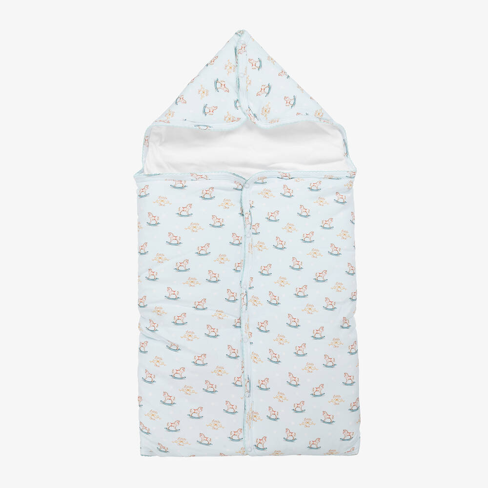 Pale blue padded nest for baby boys by My Little Pie, made from beautifully soft organic Supima cotton jersey. Warm and cosy, it is patterned with a charming rocking horse design, with the words 'Little One' adding a sweet touch. It has an embroidered blue picot trim around the edge and secures with easy-to-use poppers on the front and hood. When unfastened it can be laid flat, providing a comfortable surface for changing or playing.