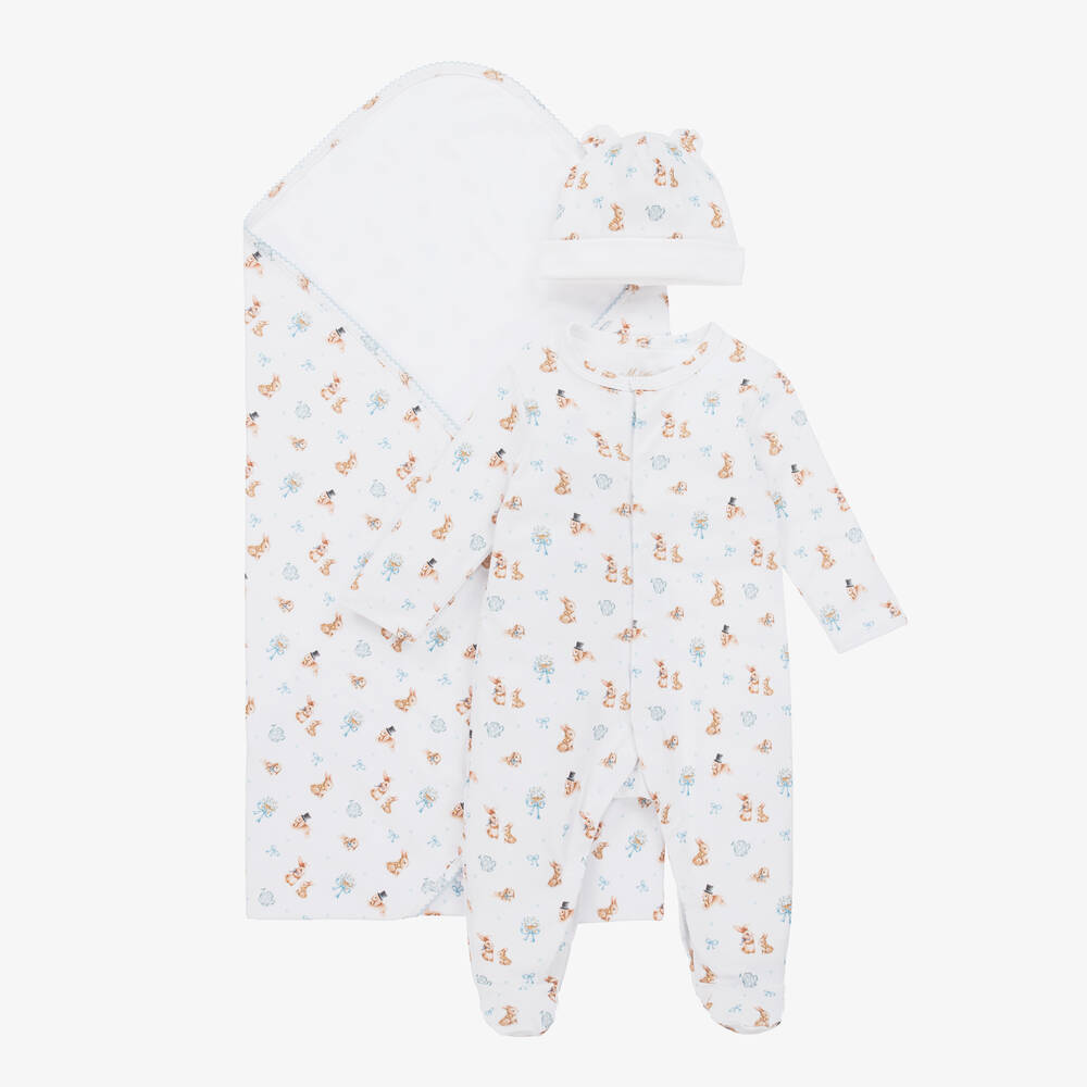 Super soft organic Supima white cotton babysuit set for boys by My Little Pie. Gentle against delicate skin and patterned with a sweet bunny rabbit print, the babygrow will keep your little cosy and looking cute. A matching layette hat and blanket complete the set.