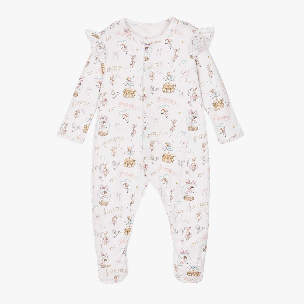 For girls from My Little Pie, a lovely white babygrow made from super soft organic Supima cotton to be cosy against delicate skin. For a sweet finish, it is patterned with ballerinas and bunny rabbits amongst musical notes.
