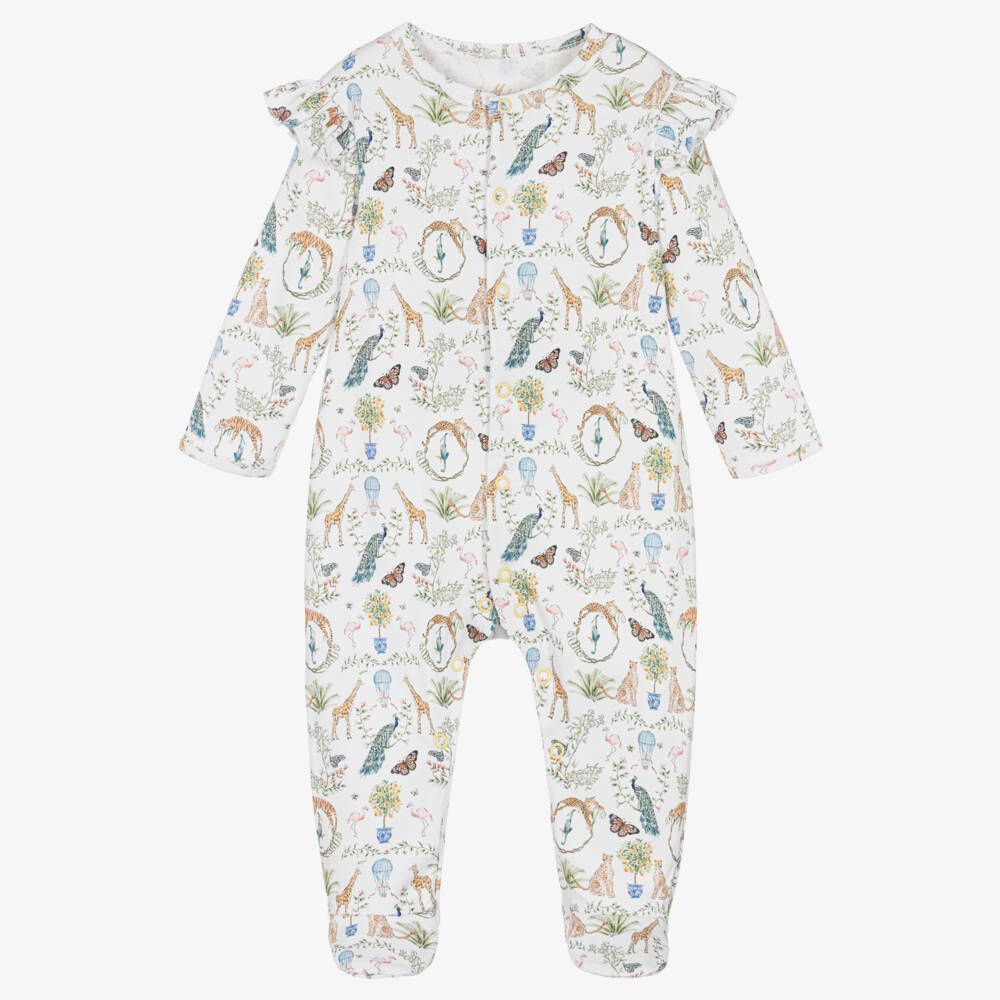 Lovely white babygrow for girls by My Little Pie, made in soft, organic Supima cotton jersey. It has a beautiful green and beige Bohemian print of giraffes, leopards, peacocks and hot air balloons. With cute ruffle trims on the shoulders, it fastens easily with poppers on the front and between the legs.