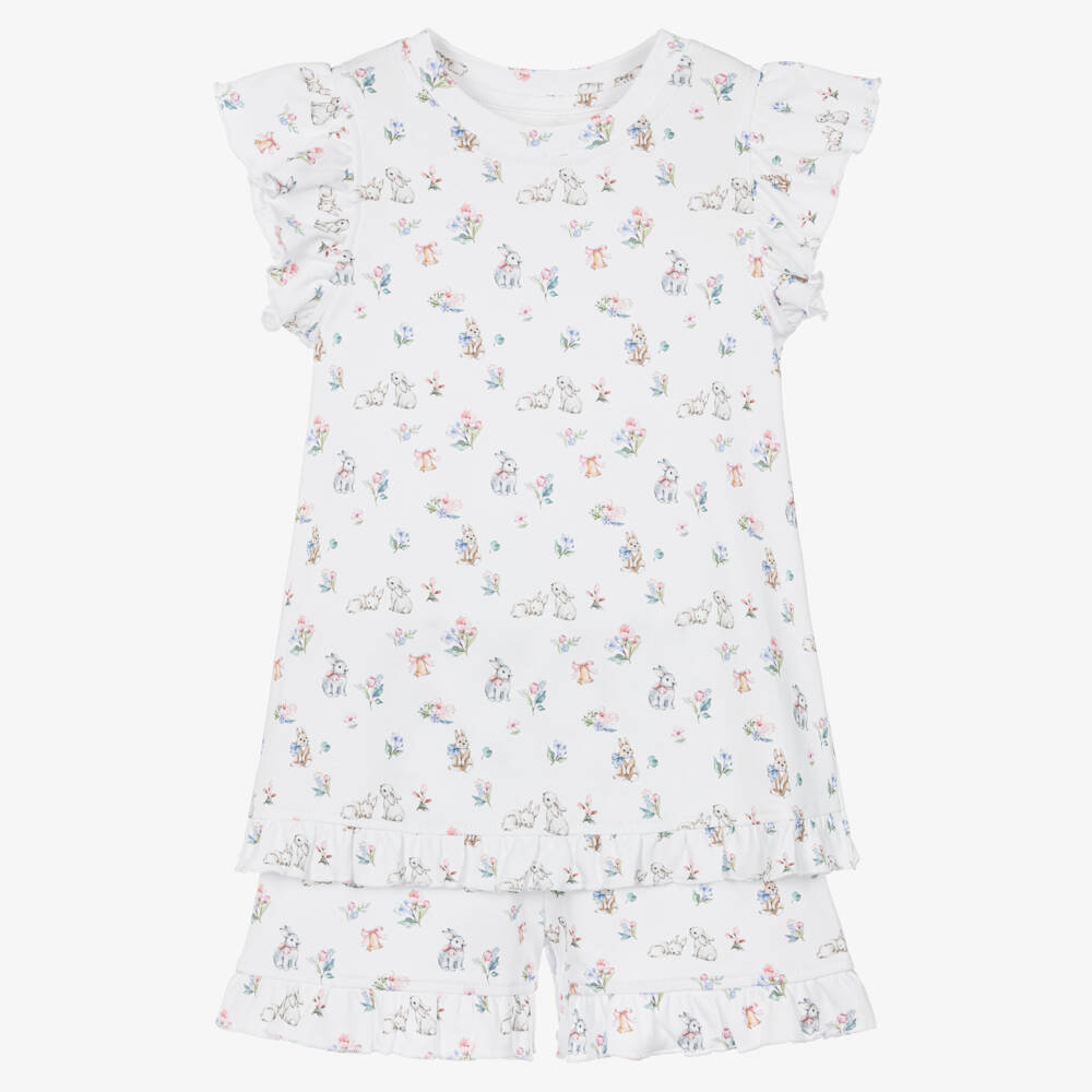Girls white pyjamas by My Little Pie, made in soft, organic Supima cotton jersey. They have a super cute blue and pink Muffin print of bunnies, flowers and bells. The shorts have an elasticated waist for bedtime comfort.