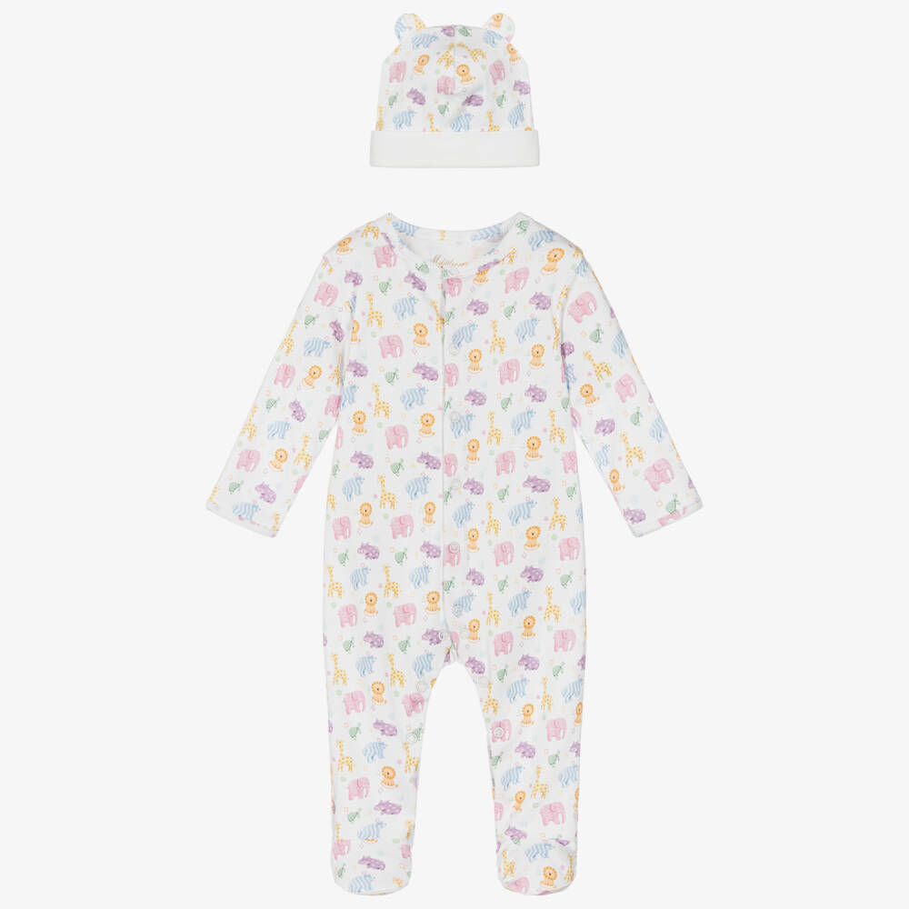 Cute white babysuit set for girls by My Little Pie, made in soft, organic Supima cotton jersey. Both pieces have an adorable, pastel Rainbow print of hippos, giraffes, lions and bears. The babygrow simply fastens with poppers on the front and between the legs. A layette hat with sweet 3D ears completes the set.