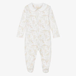 Exclusive to Childrensalon, white babygrow for baby girls by My Little Pie. Made from organic Supima cotton jersey, they have a pretty pink and blue floral print, and fasten with poppers on the front and between the legs for easy dressing.