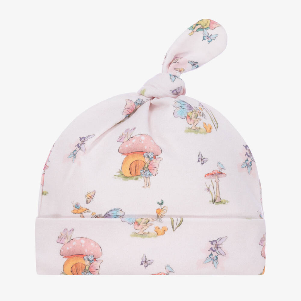 Sweet pink hat for baby girls by My Little Pie, patterned in a beautiful and colourful fairies illustration. It is made in super soft organic Supima cotton jersey, with a turned up brim and cute top knot.