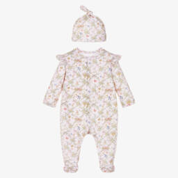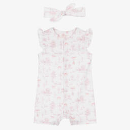 Sweet white and pink babysuit set for girls by My Little Pie, made in soft organic Supima cotton jersey. This charming set includes a ruffled babygrow, a double layer bib for extra absorbency and a hat with cute ears, all featuring a romantic pastel-coloured print with rocking horses, carousels and hot air balloons.