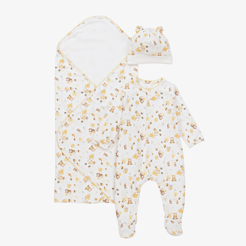 Sweet white babysuit set for boys and girls by My Little Pie, made in soft, organic Supima cotton jersey. All pieces have an adorable yellow and beige Honey print of bears, bees, hearts and honey pots. The babygrow simply fastens with poppers on the front and between the legs, and has yellow embroidered picot trims. A layette hat and beautifully soft blanket completes the set.