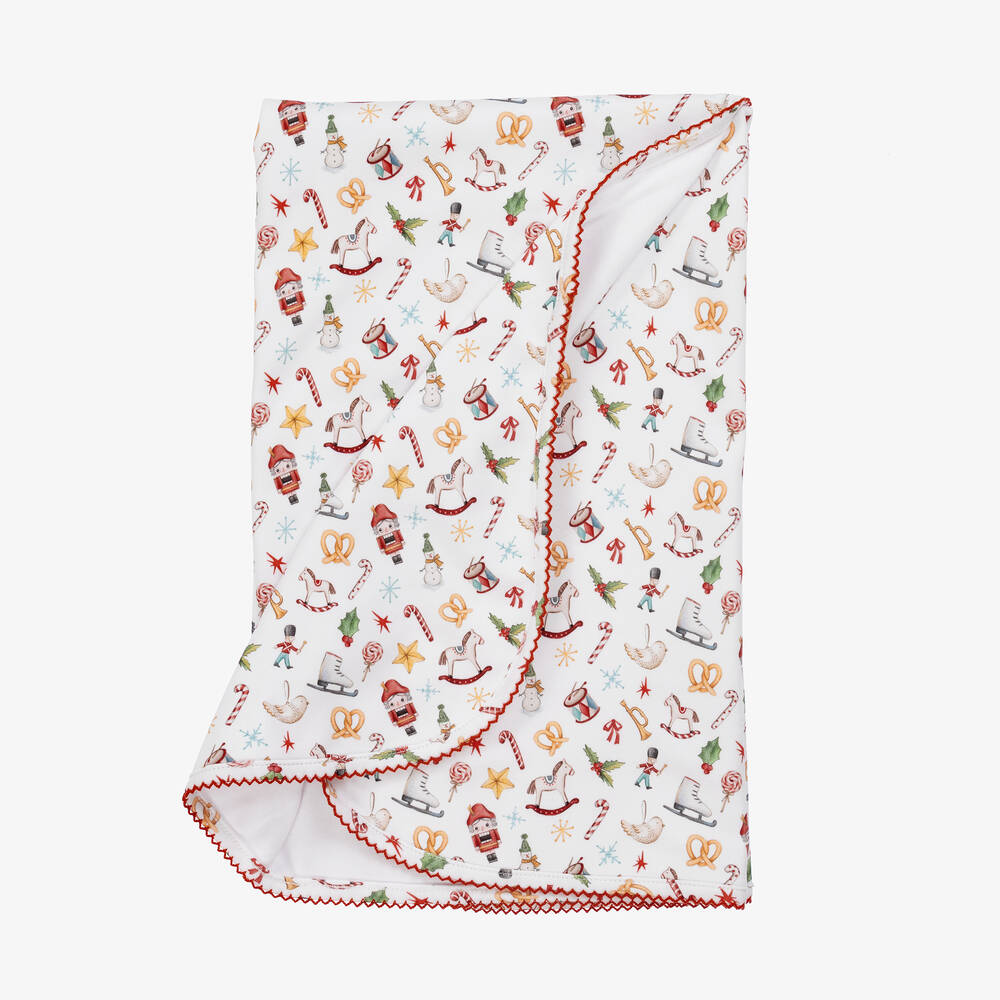Patterned in a delightful Christmas-themed print in red and green, this white blanket for baby boys and girls is by My Little Pie. It is made in a double layer of super soft organic Supima cotton jersey, with delicate picot embroidery trim. Ideal for use in the car seat or stroller, it also makes an attractive nursery accessory.