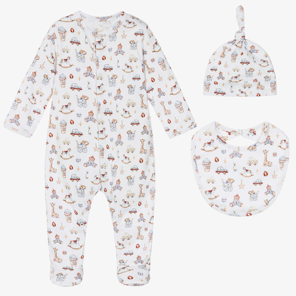 Lovely white babysuit set for boys and girls by My Little Pie, made in soft, organic Supima cotton jersey. All pieces have an adorable red and beige print of prams, teddy bears and rocking horses. The babygrow simply fastens with poppers on the front and between the legs. A layette hat and popper fastening bib completes the set.
