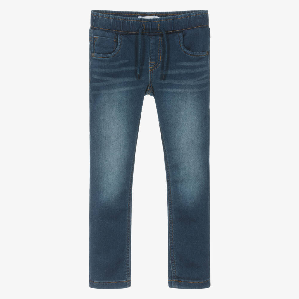 Dark blue jeans for boys by NAME IT, combining the authentic look of denim with the comfort of jersey. These slim-leg trousers have five-pocket detailing and an adjustable waistband for when they grow. The ankles can be turned up for a more casual look.