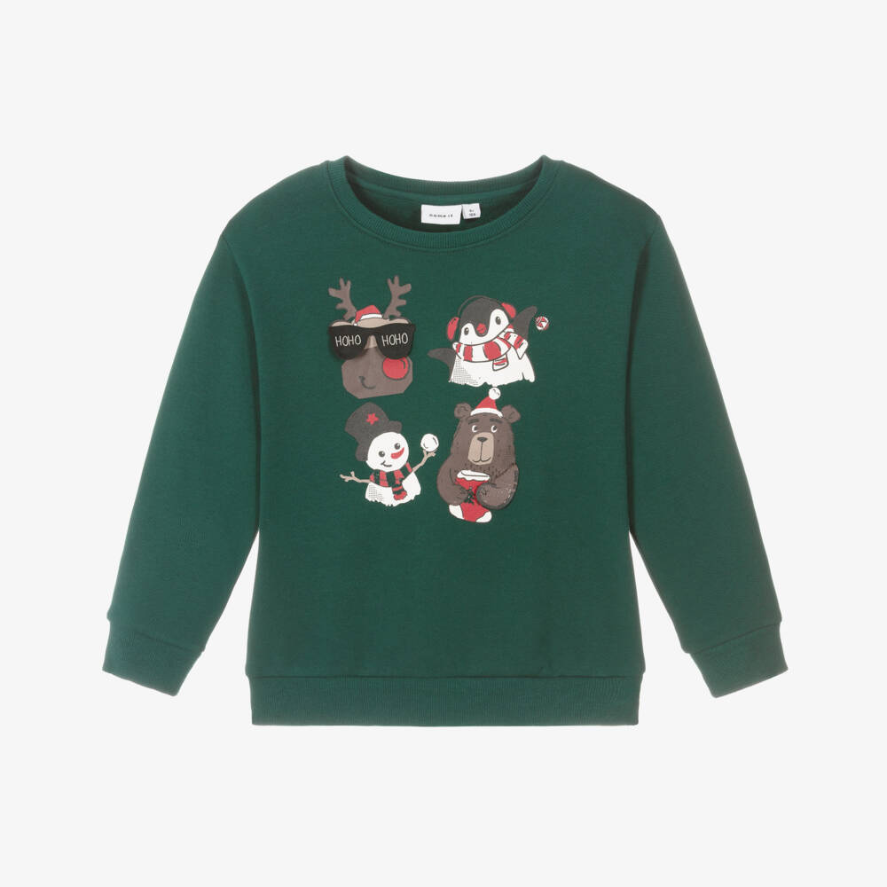 Dark green organic cotton Christmas sweatshirt for boys by NAME IT, with lift-the-flap festive appliqués on the front. It is made in comfortable jersey with a cosy, fleecy inside.