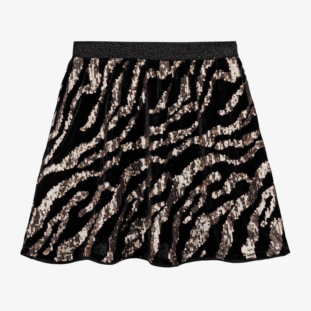 Designed with a gorgeous gold sequin zebra pattern, this black velour skirt for girls is from Danish brand, NAME IT. Combining party-ready style with comfort, the sequins catch the light beautifully and the stretchy waistband is woven with glittery thread for added sparkle. It is complete with a soft and stretchy jersey lining.