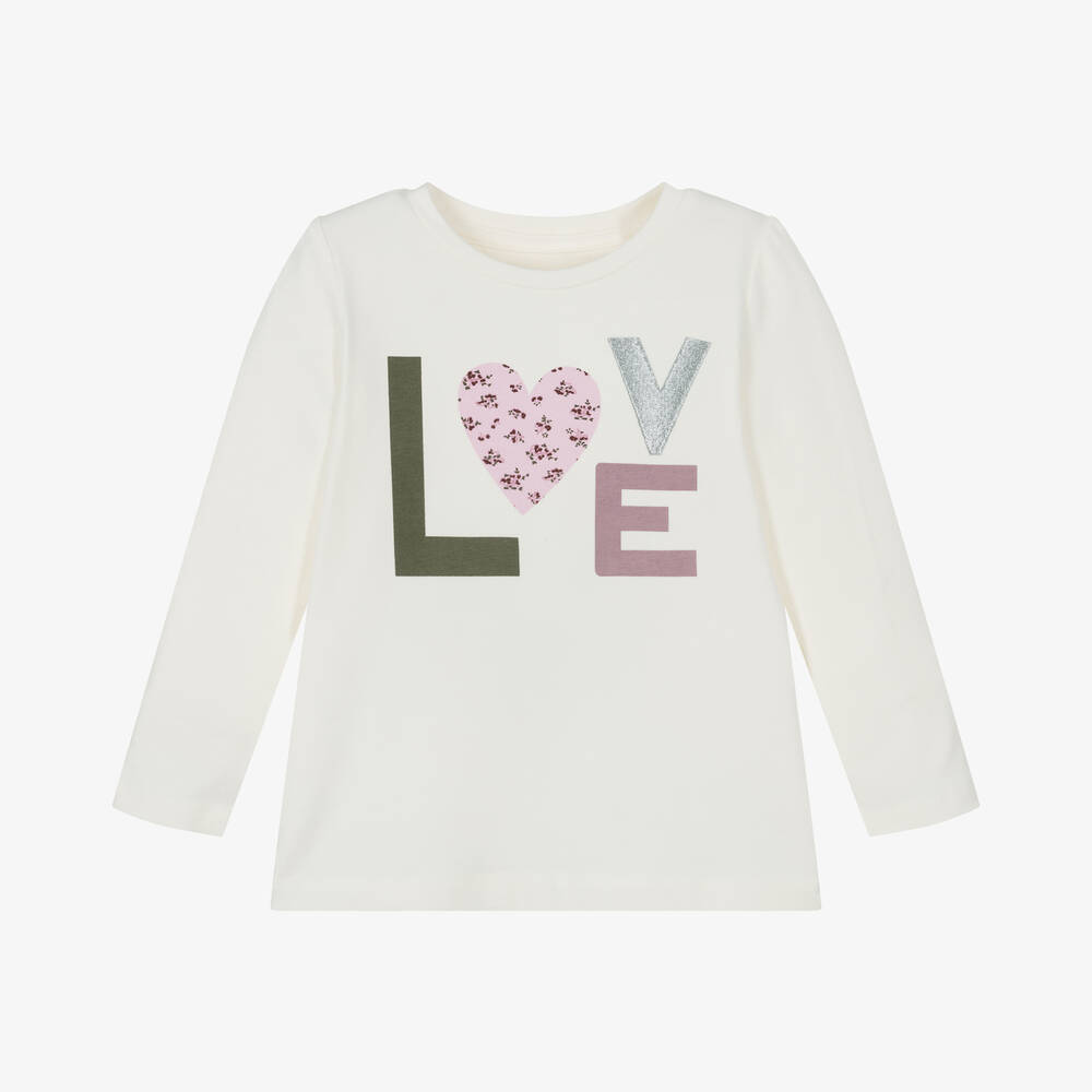 Ivory top for girls by NAME IT, made in stretchy organic cotton jersey. The 'LOVE' lettering on the front features a pretty floral heart and metallic silver thread.