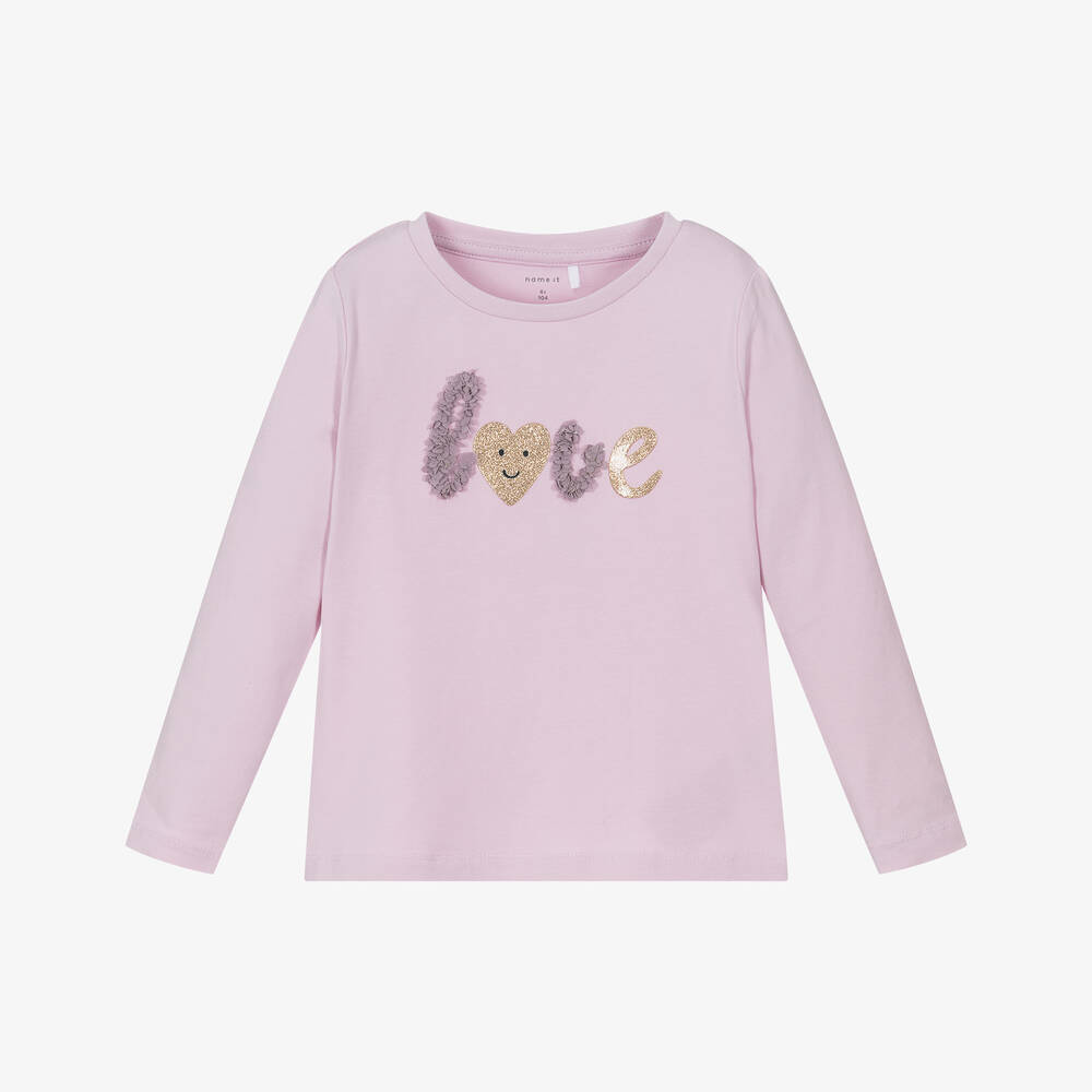 Eye-catching pink organic cotton top for girls by NAME IT, with 'love' appliquéd and printed in crêpe chiffon and glittery gold, along with a happy heart on the front. Super soft and stretchy, it is made in comfortable jersey.