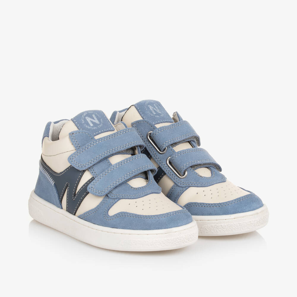 Sporty ivory leather trainers for boys by Naturino, with contrasting blue suede leather trims. Designed with a comfortable leather lining and lightly cushioned insole, these casual shoes have a non-slip rubber outer sole for good grip. Ensuring a secure fit, they fasten with easy-to-use velcro straps across the foot.