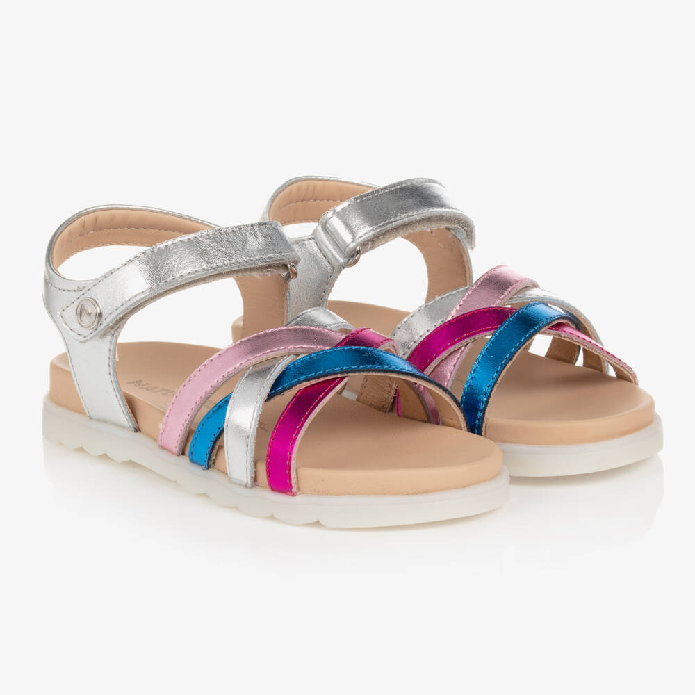 Fun leather sandals for girls by Naturino, in shades of metallic silver, pink and blue. Adding sparkle to every step, these open-toe sandals have contrasting straps over the toes and an adjustable velcro strap fastening across the ankle for a secure fit. They have a comfortable leather insole and a non-slip rubber sole for a good grip.