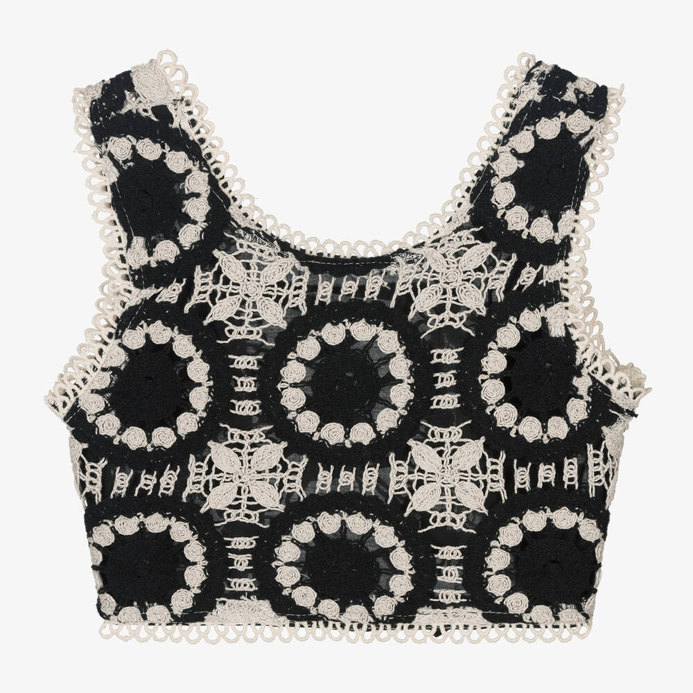 Cropped, cool and stylish, this black and ivory crochet top for girls by American luxury resort and swim wear brand Nessi Byrd is made in soft cotton. With a circular and floral design, it has embroidered, scalloped trims and a lace-up tie fastening on the back. The front has a lightweight, cotton voile lining.