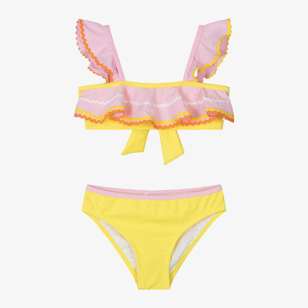 Light pink and bright yellow bikini for girls by Nessi Byrd, made in silky smooth and stretchy fabric with UV50. Lined on the front, the top has a layered ruffle with orange, yellow and white ric rac trims. It ties on the back and features identical detailing on the lightly ruffled shoulder straps. The matching bottoms have a pink elasticated waistband for unrestricted movement.