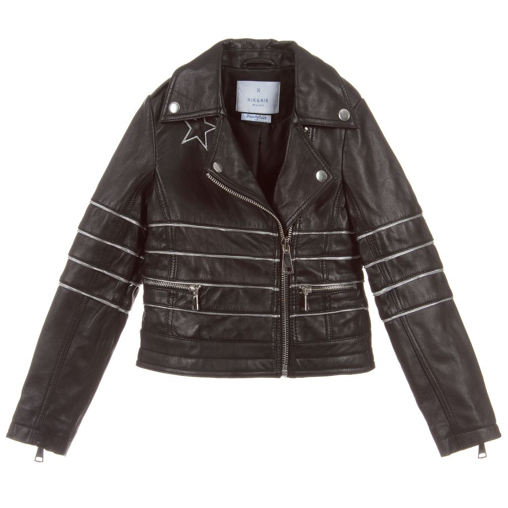 Made in collaboration with BeautyNezz and NIK&NIK, this super soft black leather jacket for girls, has a silver trim and a silky satin lining. It has silver piping across the body and sleeves and embroidered stars on the front and back and fastens with a chunky metal zip down the front.