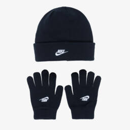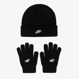 Ideal for cooler weather, this black Nike hat and gloves set will keep boys cosy. Made in a soft, double layered knit for warmth and comfort, the beanie-style hat has a turned-up brim embroidered with the brand's signature Swoosh logo in contrasting white. It comes with matching gloves.