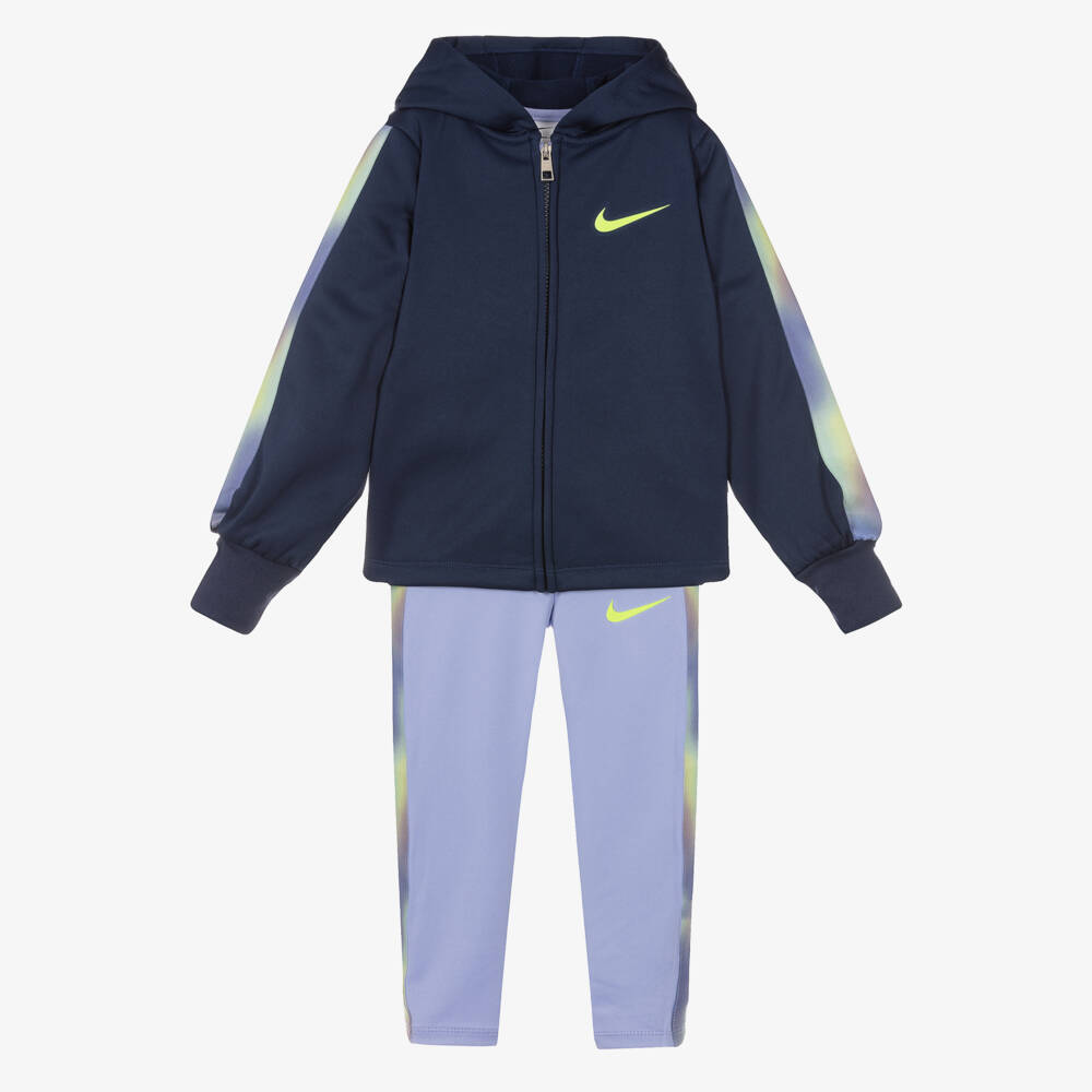 A navy blue and periwinkle purple leggings set for little girls by Nike. The soft, stretchy jersey hoodie features the brand's Therma-FIT technology, ensuring your little one stays cool and comfortable. A neon green Swoosh logo, branded front zip and lilac purple and pastel green sleeve panels finish this sporty top. Using Dri-FIT technology to wick sweat away from the skin, the purple lycra leggings have a green Swoosh logo and matching panels running from the elasticated waist to the cuffs.