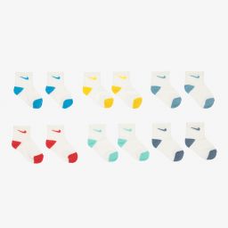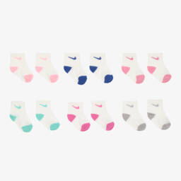 Six pairs of comfortable ivory ankle socks for younger girls from Nike. Soft, stretchy and ribbed around the ankle, they have the Swoosh logo and trims in assorted colours of green, grey, blue and different shades of pink.