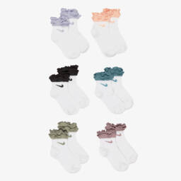 ستة أزواج من الجوارب البيضاء المريحة للبنات الرضع من ماركة نايك. مصنوعة من مزيج ناعم ومرن من القطن، كل زوج يتميز بشعار سووش الأيقوني وحافة مزينة بكشكش جميل بألوان متنوعة.