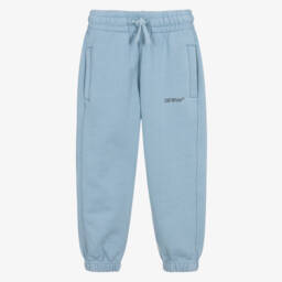 Navy blue mid-weight cotton joggers for boys by Off-White, made in comfortable jersey with a cosy, fleecy inside. Unmistakably by the brand, they have the white bookish logo printed on one side and the diagonals logo on the back of the legs. An elasticated, drawstring waist provides a good fit, and there are useful pockets on the front.