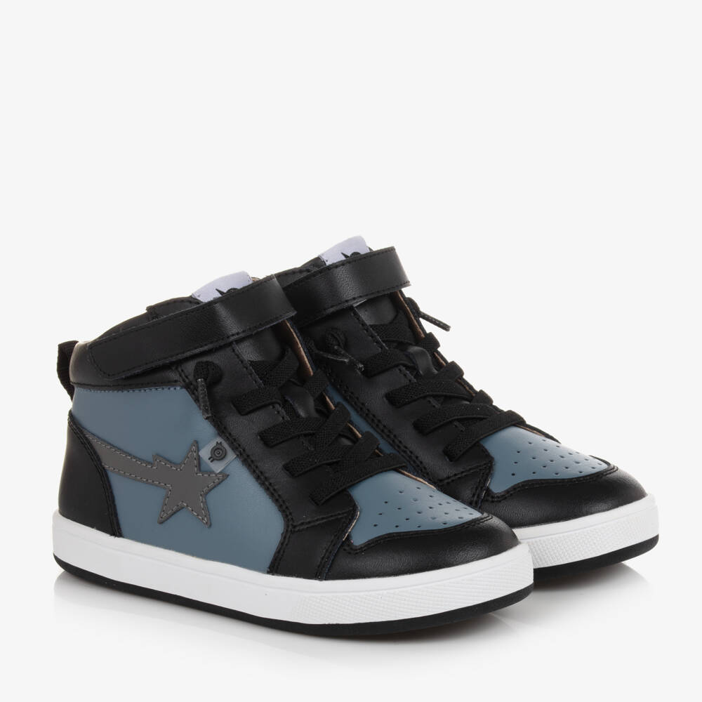 A pair of slate blue and black trainers for boys and girls from Australian brand Old Soles, with a tonal star appliqué on the side. These cool high-tops are made in beautifully soft leather, with a breathable faux leather lining and flexible, rubberised soles for comfortable wear. They have cushioned insoles to help support posture and balance. Easy to slip on, they are designed with elasticated laces and a velcro strap for simple dressing. They are detailed with a small logo tab on one side and a branded label on the tongue.
