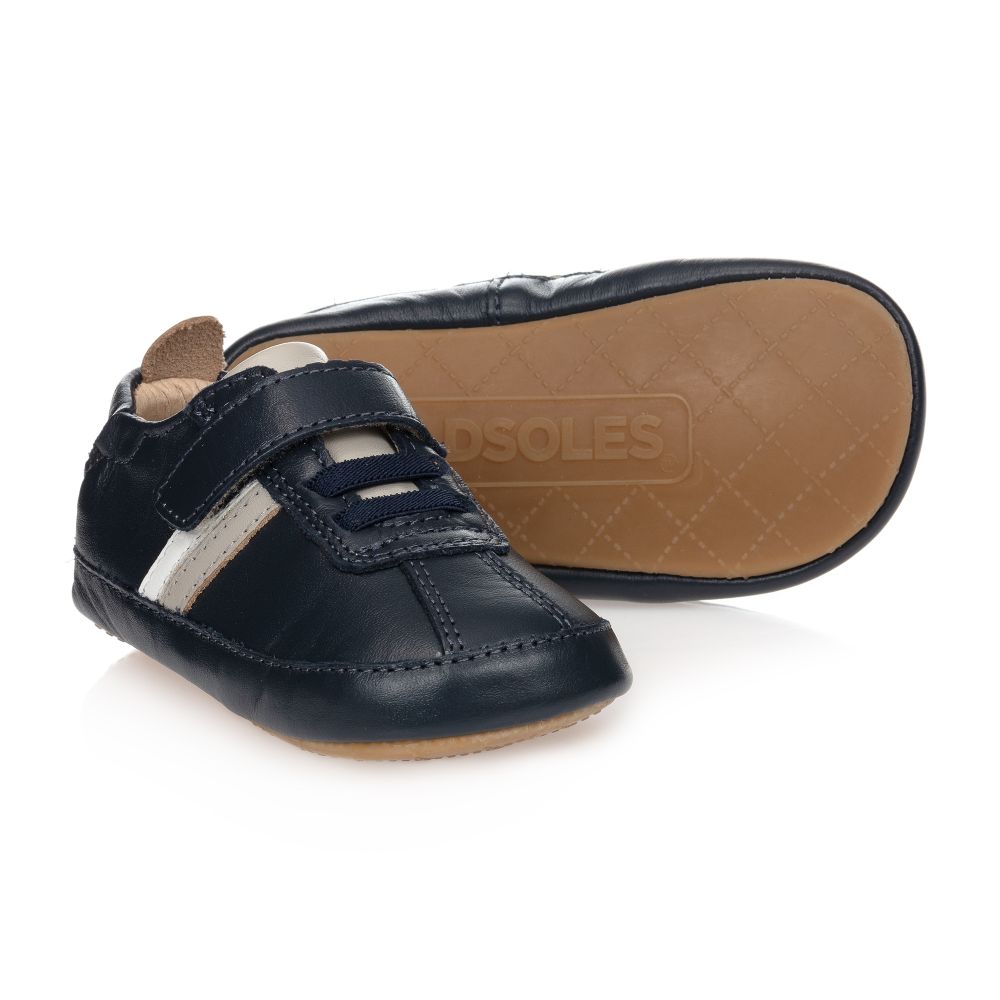 Navy blue soft leather shoes for baby boys by Old Soles. Perfect for growing feet, these pre-walkers have an elasticated heel for easy dressing, with stretchy laces and a velcro strap to secure snugly. They have a flexible rubber outer sole and are fully lined in soft leather.