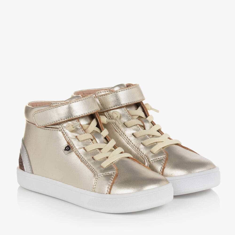 Comfortable and stylish high-top trainers for girls by Old Soles, made in soft metallic gold leather. They have an eye-catching silver and glittery gold rainbow trims on the heel and a tiny logo tab by the elasticated laces. They are fully lined in breathable microfiber with a cushioned insole and padded ankle cuffs for extra support. There is a velcro strap to secure at the ankle and white rubber outsole for better grip.