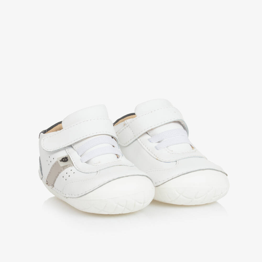 White first walkers for little boys by Old Soles, made in soft and supple leather with a breathable microfibre lining. These lightweight and flexible shoes are designed to look just like trainers with elasticated laces and an easy-fitting velcro fastening. They have beige stripes on the outer foot and an anti-slip rubber sole for a sturdy, comforting grip.