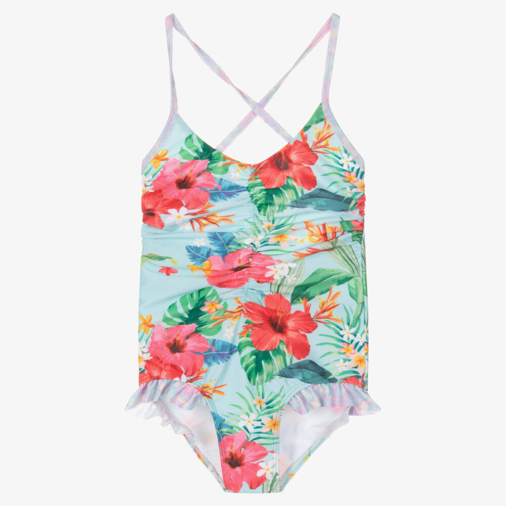 Aqua blue swimsuit for girls by Australian swimwear brand Olga Valentine, made in silky soft and stretchy fabric with a UPF 50+. In a tropical pink floral print, this fun one piece is fully lined for comfort and features ruching on the front. The ruffle trims on the leg are designed in a contrast pink and lilac purple marble print. The slim shoulder straps crossover and tie on the back for a fully adjustable fit. This item is made with recycled Repreve fabric.