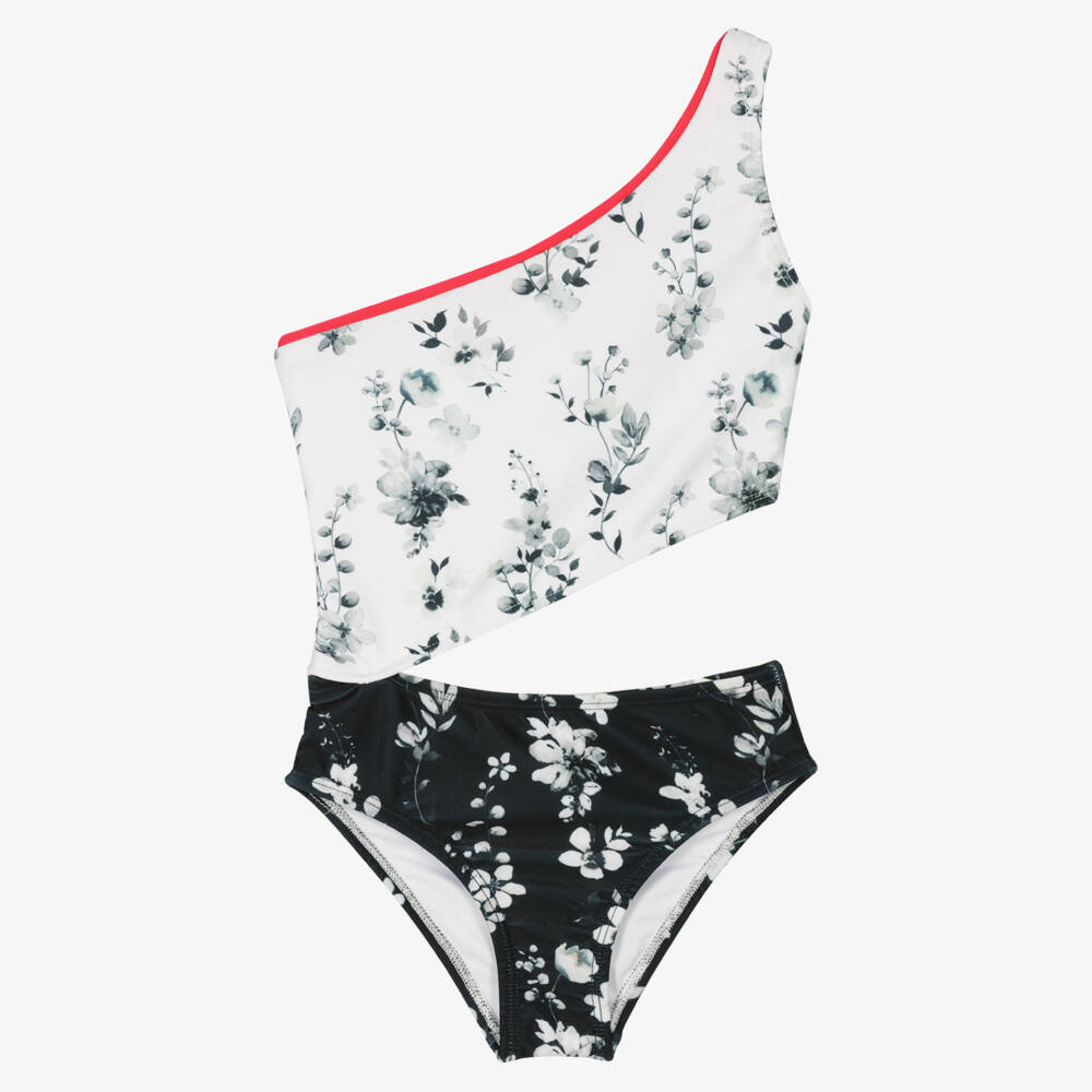 White and black swimsuit for girls by Australian swimwear brand Olga Valentine, with a floral pattern and a red trim. Ideal for making a statement poolside or by the sea, it has an elegant, one-shoulder design with a cut-out side. Silky, stretchy and fully lined for comfort, it is made in recycled Repreve materials with a UPF50+.
