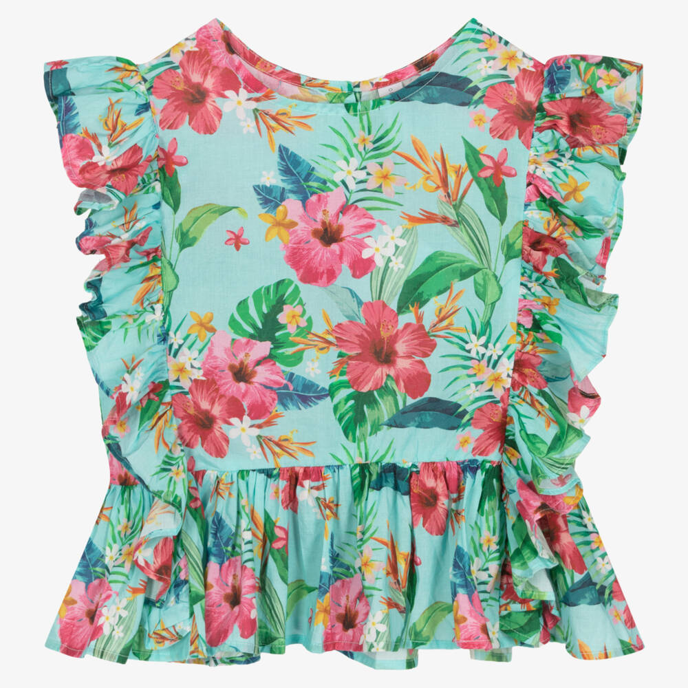 In a bold tropical design, this aqua blue blouse for teen girls is from Australian swimwear brand, Olga Valentine. Lovely as a beach cover-up, this lightweight cotton top is patterned with vibrant pink flowers and has flowy ruffled trims on the sides. There are pearlescent button fastenings on the back to complete the look.