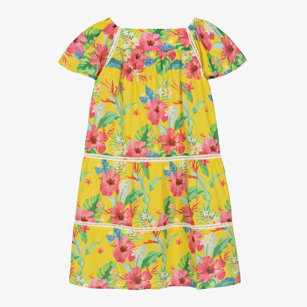 فستان تينز بناتي قطن لون أصفر بطبعة ورود