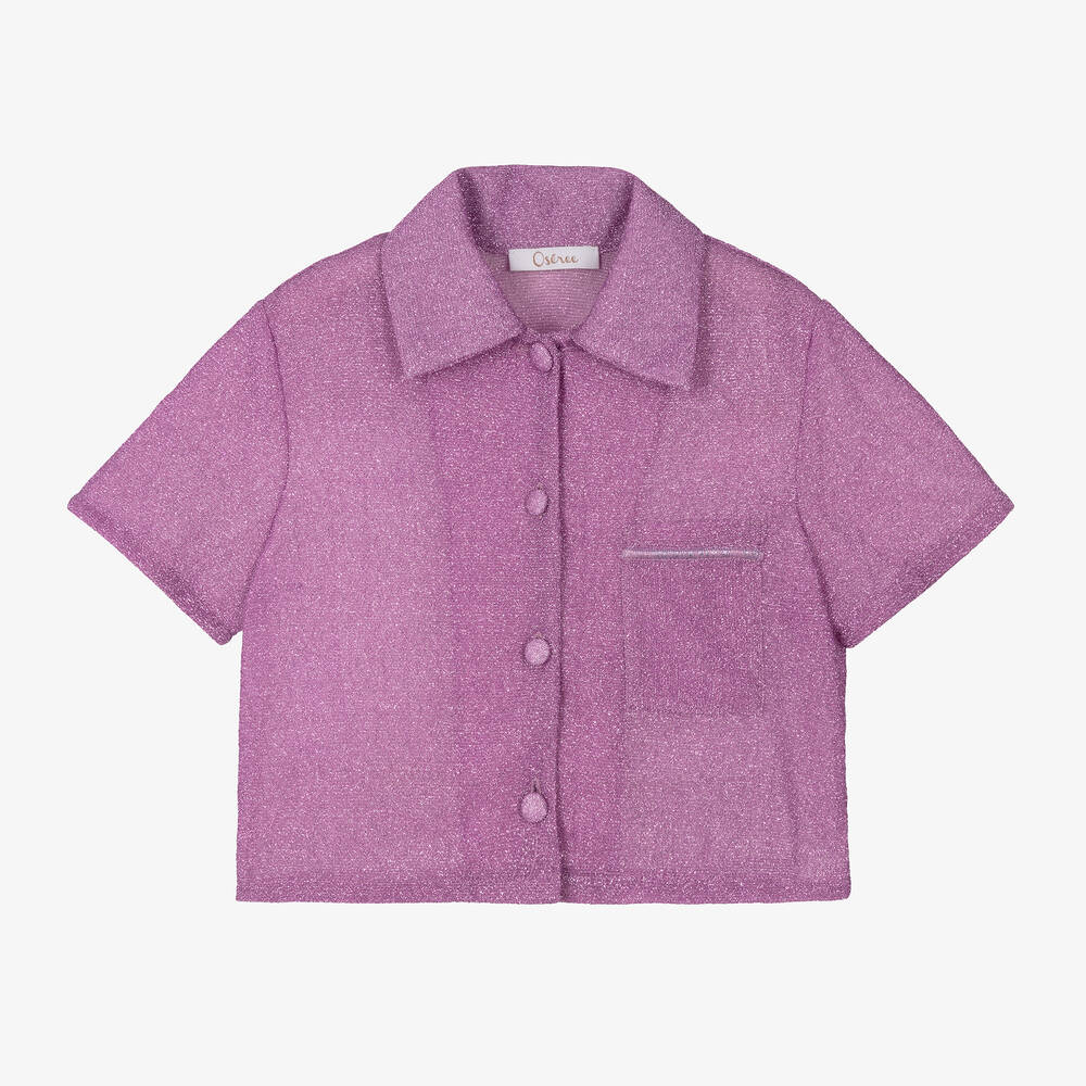 In a gorgeous purple shade, this cropped short-sleeved shirt for girls is from luxury resort wear brand, Oséree. A signature look for the label, it is woven in soft and stretchy lumière fabric with an eye-catching glitter sparkle. This boxy-fit, bowling-style shirt is complete with a chest pocket detail and covered button fastenings.