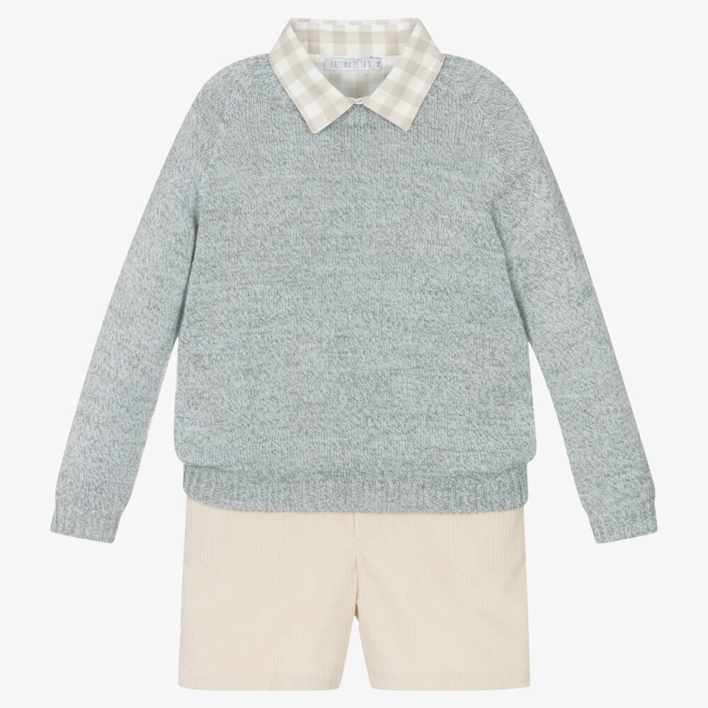 Charming shorts set for younger boys by Paloma de la O. The ivory beige shorts are made in soft cotton corduroy, have useful pockets and a comfortable adjustable waistband. The beige gingham checked cotton shirt has a smart pointed collar, with button fastenings on the front and cuffs. A lightweight grey knitted sweater with stretchy ribbed trims, completes this lovely set.