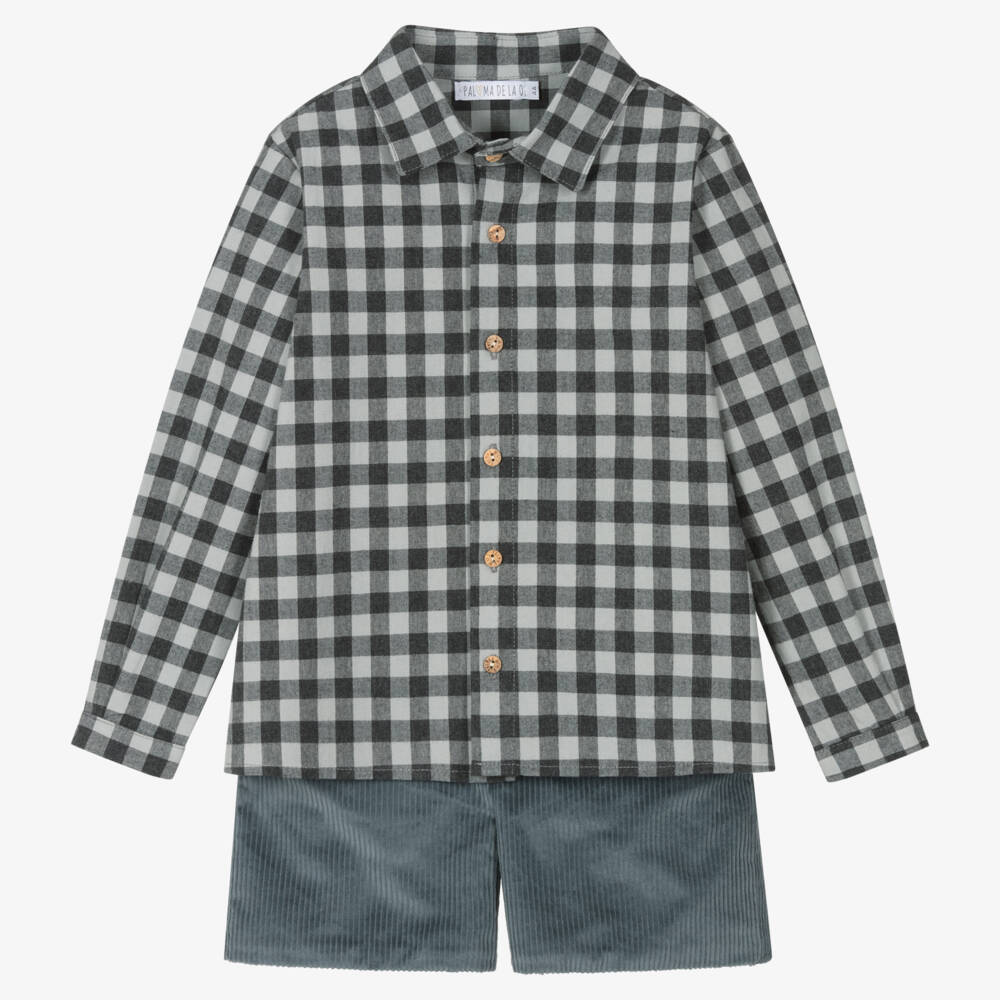 Smart-casual petrol blue shorts set for younger boys by Paloma de la O. The cotton corduroy shorts have pockets on the front and a comfortable adjustable waistband. A charming gingham checked cotton shirt completes the set. It fastens with branded buttons on the front and cuffs and has a smart pointed collar.