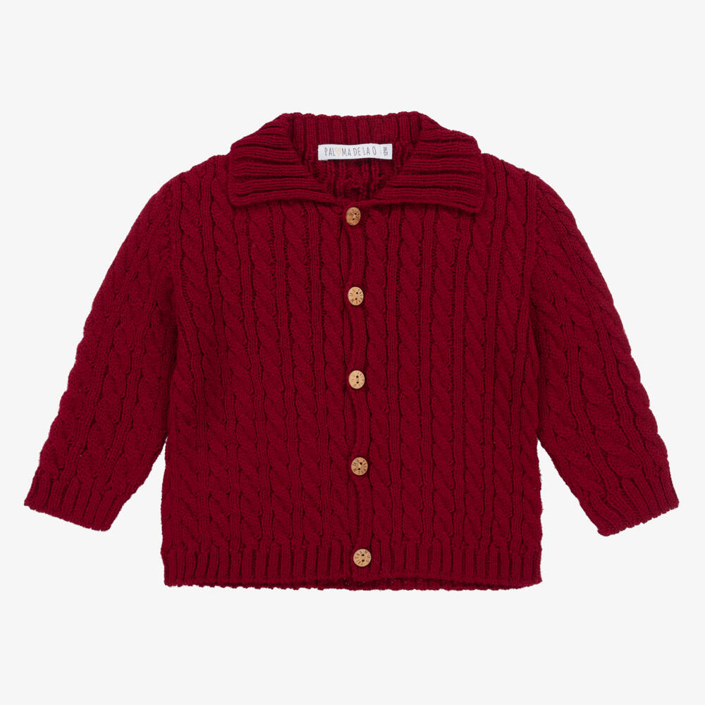 Lovely burgundy red cardigan for younger girls by Paloma de la O, made in a cosy and warm cable knit. Classically styled with a pretty ribbed collar, cuffs and hem, it fastens neatly on the front with traditional wooden, branded buttons.