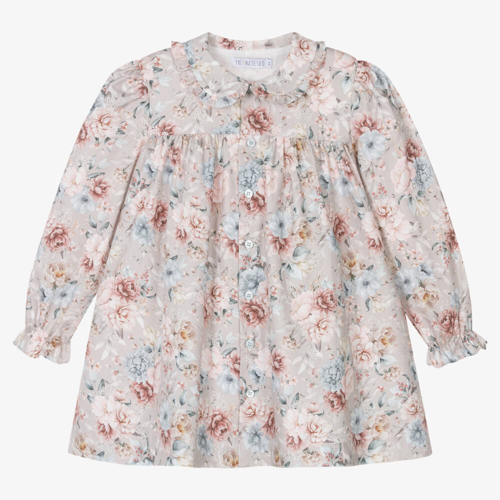 A classic grey-beige floral dress for little girls by Paloma de la O, woven in soft cotton. This pretty dress has a contrast pink and grey pattern and a Peter Pan collar with a frilled trim. It has puffed long sleeves with gently elasticated cuffs and is fully lined for comfort. Pearlescent button fastenings on the front complete the sweet design.
